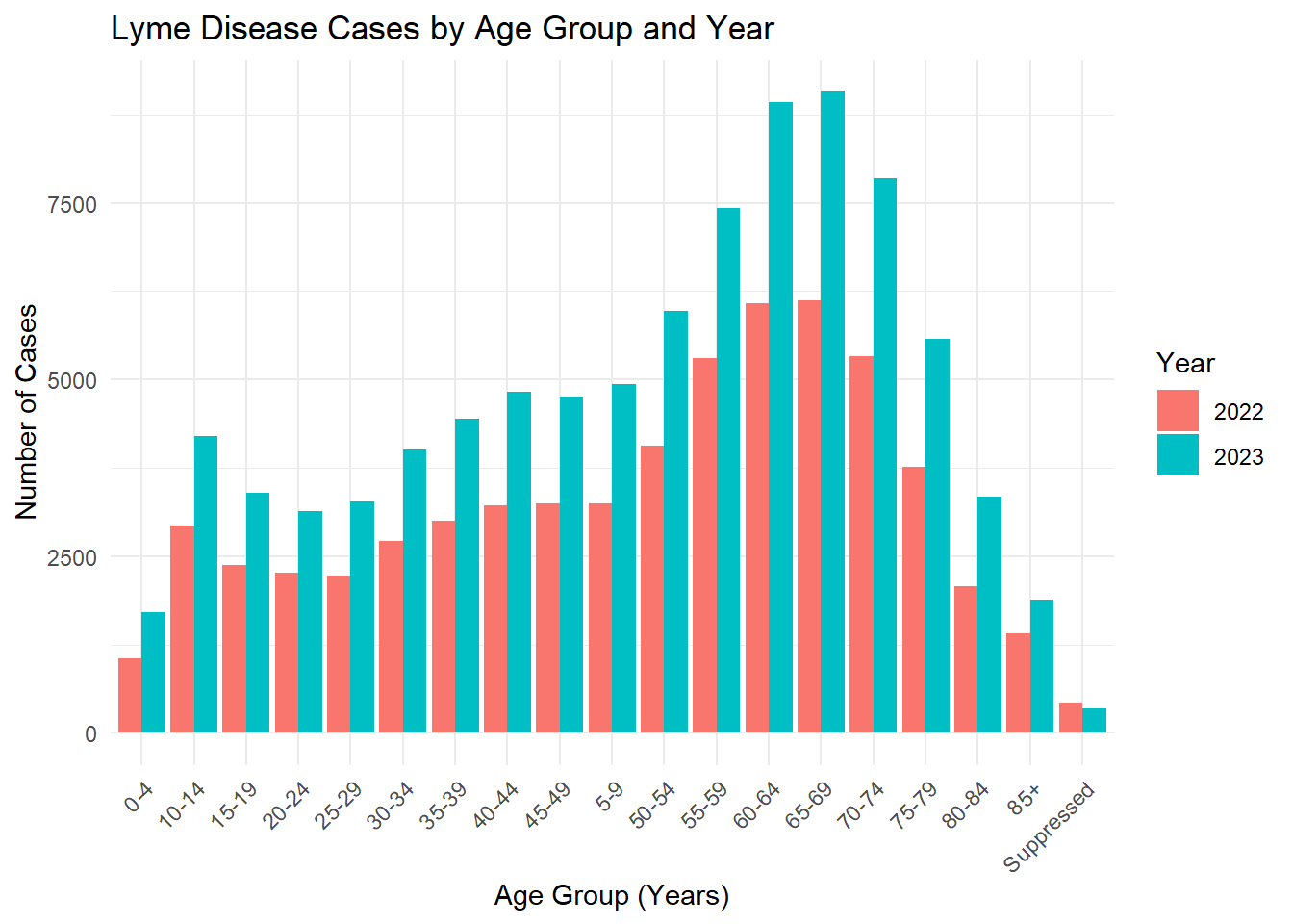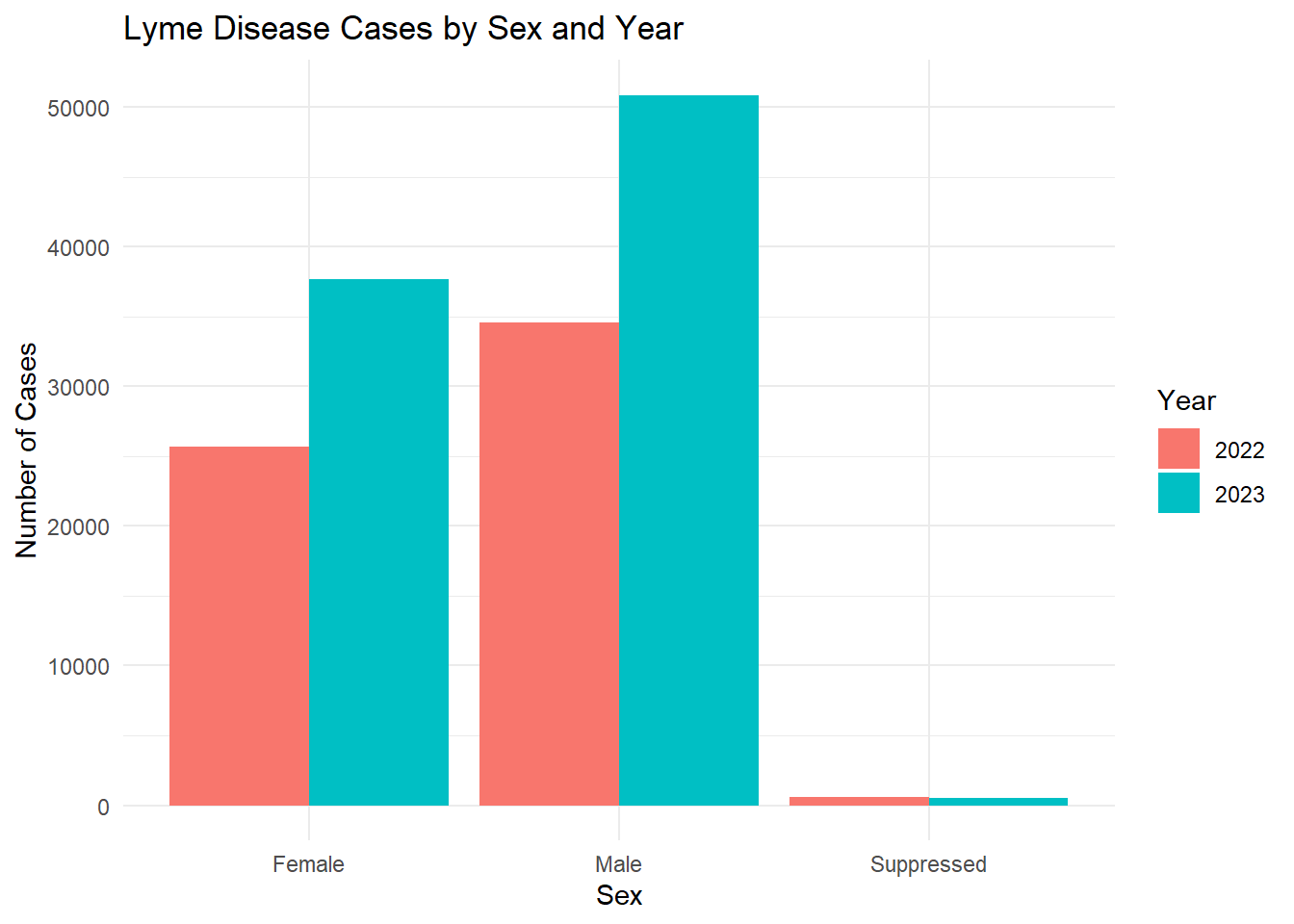 From these figures, we see that the number of confirmed or probable cases of Lyme disease increased from 2022 to 2023.