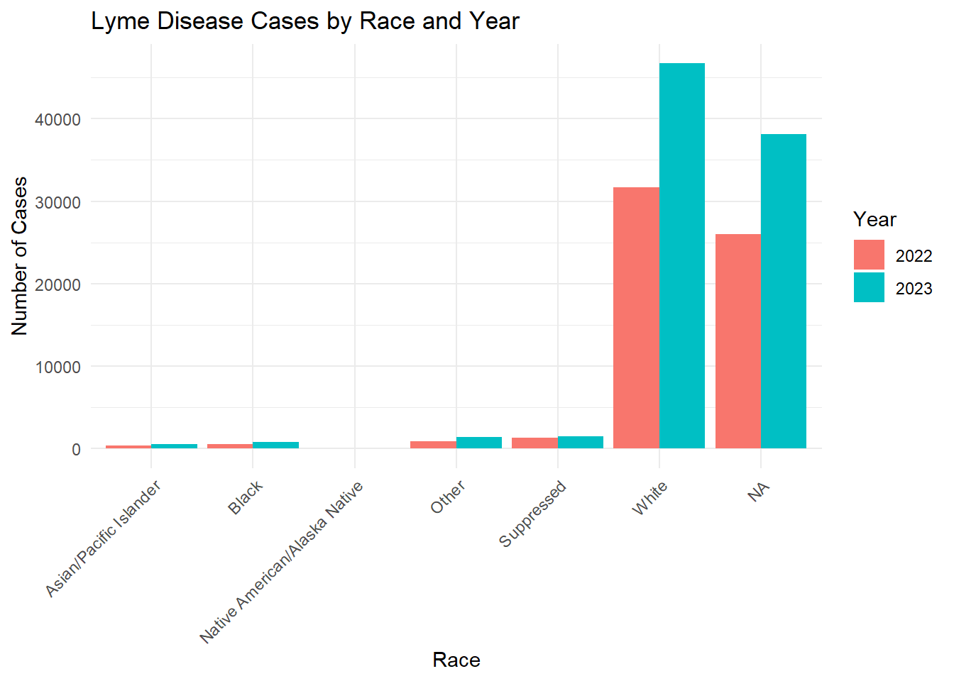 race_year_summary <- lymedisease_cleandata %>%group_by(Year, Race) %>%summarise(count =n(), .groups ="drop")# Plotggplot(race_year_summary, aes(x = Race, y = count, fill =as.factor(Year))) +geom_bar(stat ="identity", position ="dodge") +labs(title ="Lyme Disease Cases by Race and Year",x ="Race",y ="Number of Cases",fill ="Year" ) +theme_minimal() +theme(axis.text.x =element_text(angle =45, hjust =1))