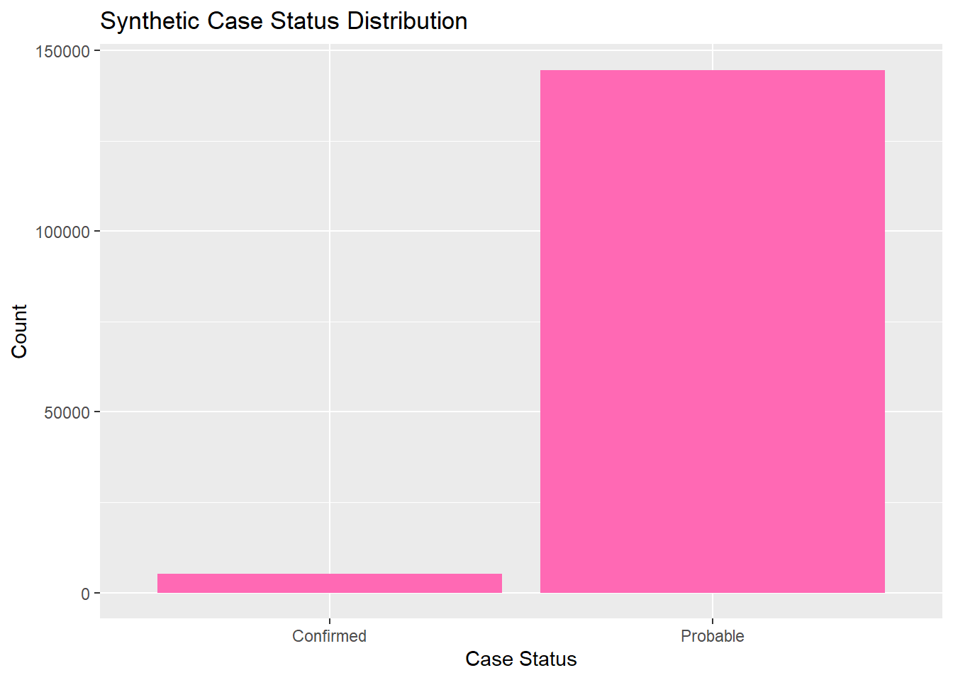 # Bar plot for case statusggplot(lymedisease_synthetic, aes(x = Case_status)) +geom_bar(fill ="hotpink") +labs(title ="Synthetic Case Status Distribution", x ="Case Status", y ="Count")