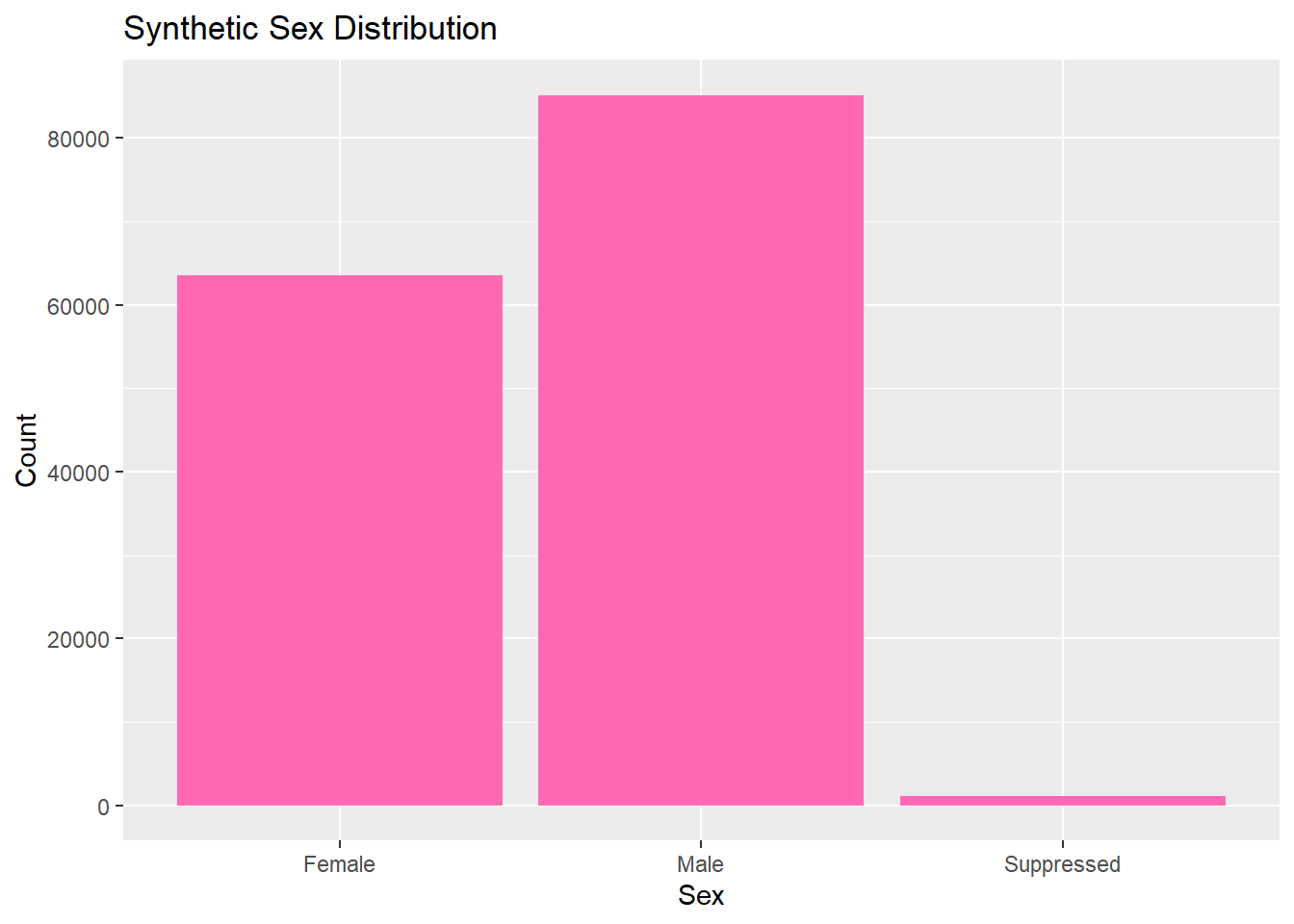 Now we can explore and analyze the synthetic data in the same way as the original set. We will look at the distributions for each catergory by looking at their frequency. All graphs and visulizations are generated in hot pink to show distinction of my contribution.