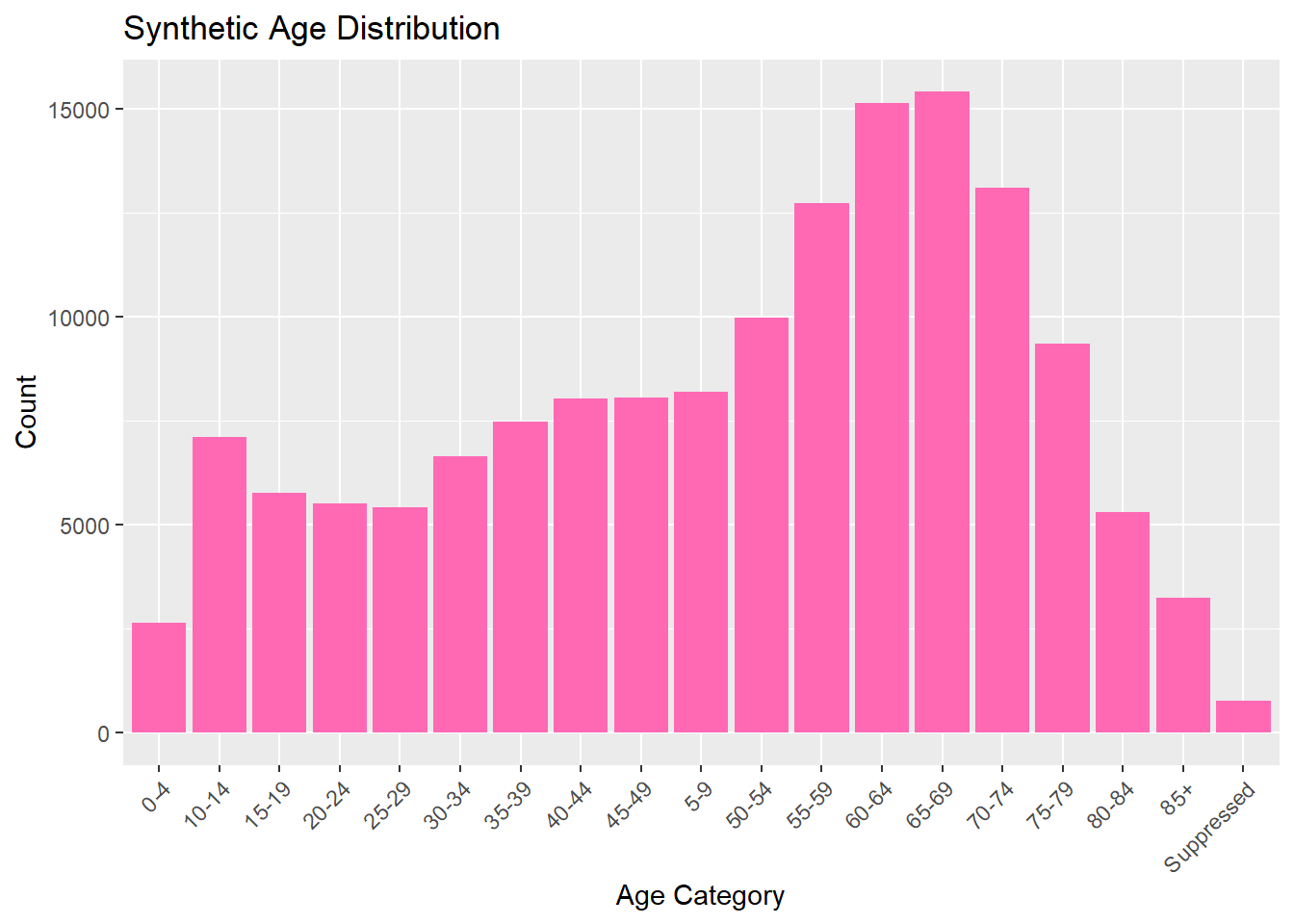 # Bar plot for ageggplot(lymedisease_synthetic, aes(x = Age_cat_yrs)) +geom_bar(fill ="hotpink") +labs(title ="Synthetic Age Distribution", x ="Age Category", y ="Count") +theme(axis.text.x =element_text(angle =45, hjust =1))