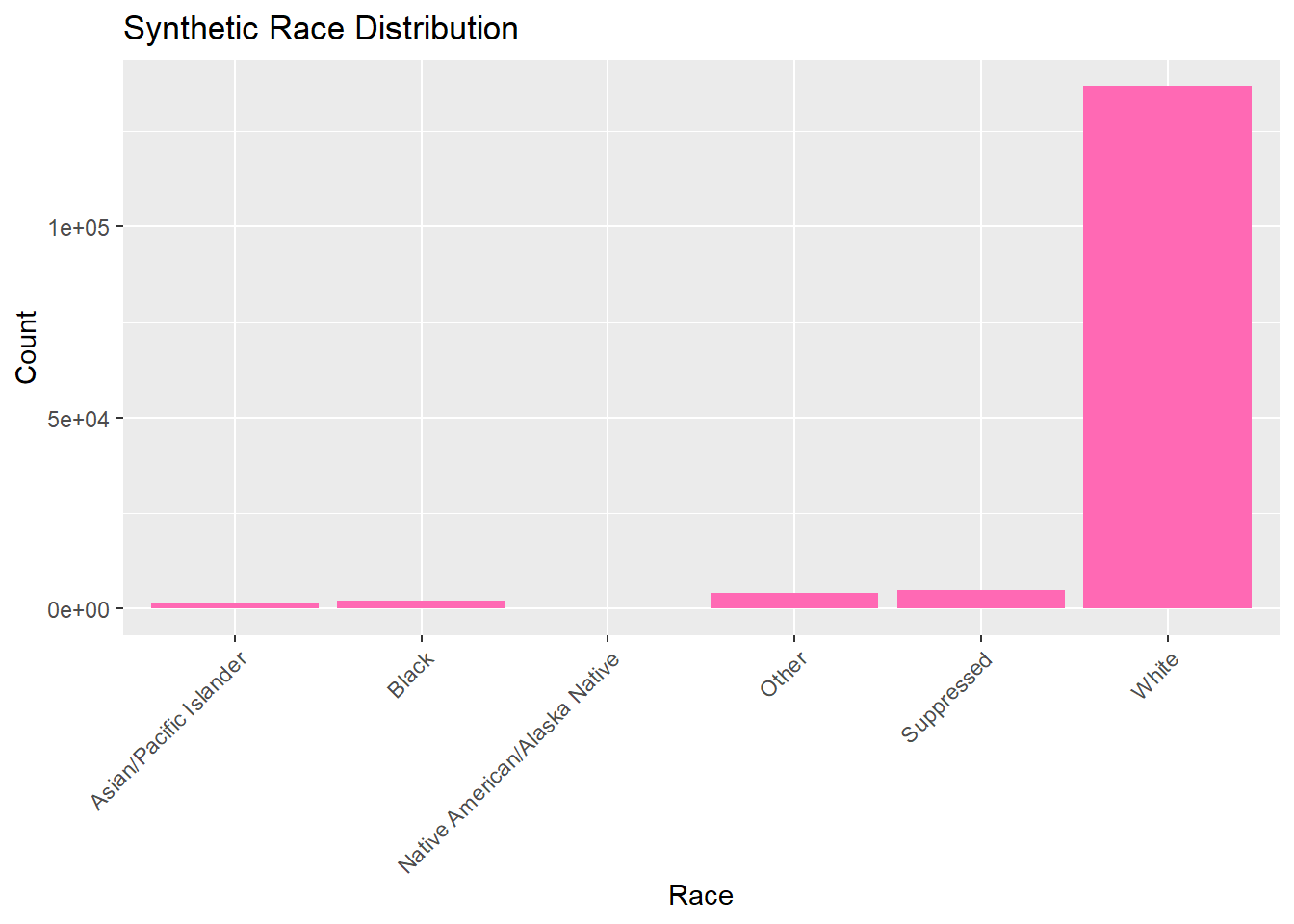# Bar plot for raceggplot(lymedisease_synthetic, aes(x = Race)) +geom_bar(fill ="hotpink") +labs(title ="Synthetic Race Distribution", x ="Race", y ="Count") +theme(axis.text.x =element_text(angle =45, hjust =1))