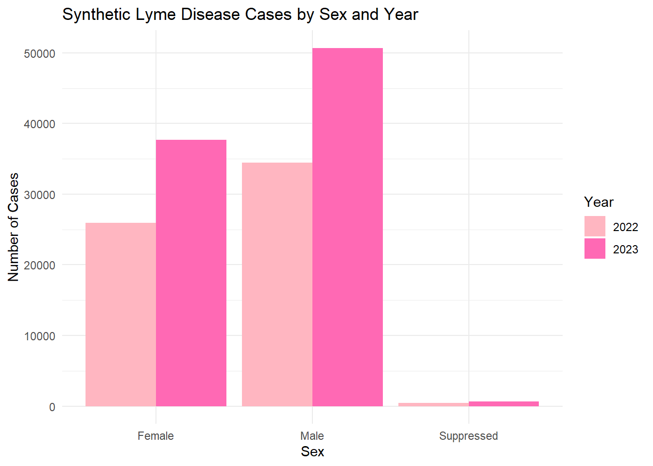 # Count synthetic cases by Sex and Year sex_year_summary <- lymedisease_synthetic %>%# synthetic data markergroup_by(Year, Sex) %>%summarise(count =n(), .groups ="drop")# Plotggplot(sex_year_summary, aes(x = Sex, y = count, fill =as.factor(Year))) +geom_bar(stat ="identity", position ="dodge") +labs(title ="Synthetic Lyme Disease Cases by Sex and Year",x ="Sex",y ="Number of Cases",fill ="Year" ) +scale_fill_manual(values=c("lightpink", "hotpink")) +# synthetic colorstheme_minimal()