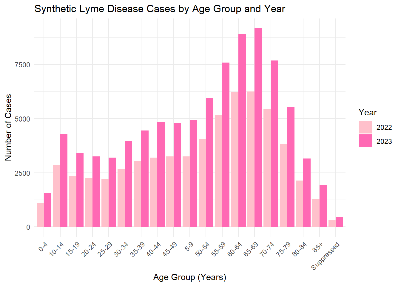 # Count synthetic cases by Age category and Yearage_year_summary <- lymedisease_synthetic %>%# Synthetic data markergroup_by(Year, Age_cat_yrs) %>%summarise(count =n(), .groups ="drop")# Plotggplot(age_year_summary, aes(x = Age_cat_yrs, y = count, fill =as.factor(Year))) +geom_bar(stat ="identity", position ="dodge") +labs(title ="Synthetic Lyme Disease Cases by Age Group and Year",x ="Age Group (Years)",y ="Number of Cases",fill ="Year" ) +scale_fill_manual(values=c("pink", "hotpink")) +# synthetic colorstheme_minimal() +theme(axis.text.x =element_text(angle =45, hjust =1))