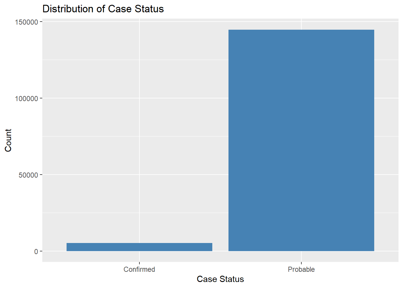 # Explore the distribution of categorical variables.ggplot(lymedisease_cleandata, aes(x = Case_status)) +geom_bar(fill ="steelblue") +labs(title ="Distribution of Case Status", y ="Count", x ="Case Status")