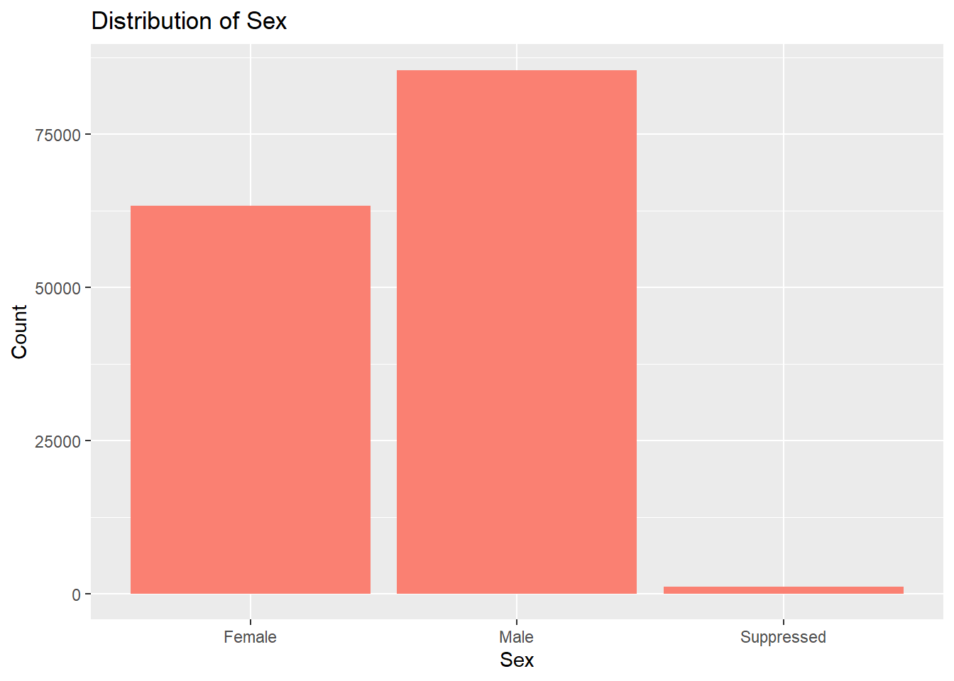 I will focus on the following variables for this exercise: - Year. This is the reporting year. No observations coded as Unknown. - Case_Status. This is the surveillance case classification as determined by local and state public health authorities. No observations coded as Unknown. - Sex. This is the patient’s sex. 1.02% observations coded as Unknown. - Age. This is the patient’s age, in 5-year age categories. 0.38% observations coded as Unknown. - Race. This is the patient’s race. 43.2% observations coded as Unknown.