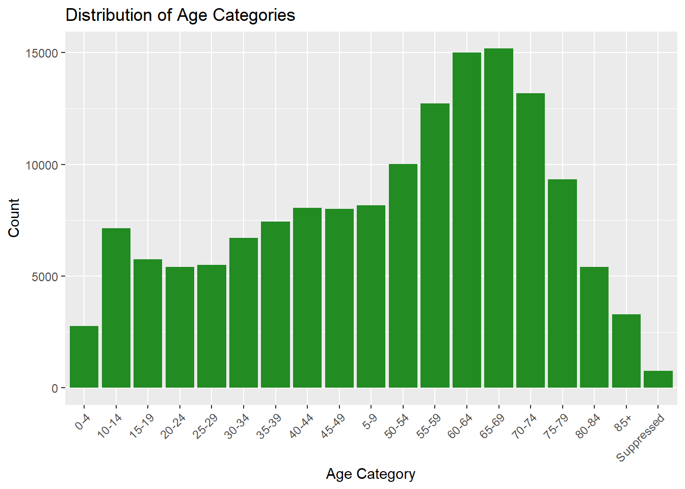 # Age distributionggplot(lymedisease_cleandata, aes(x = Age_cat_yrs)) +geom_bar(fill ="forestgreen") +labs(title ="Distribution of Age Categories", y ="Count", x ="Age Category") +theme(axis.text.x =element_text(angle =45, hjust =1))