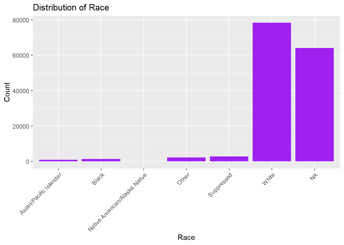 # Race distributionggplot(lymedisease_cleandata, aes(x = Race)) +geom_bar(fill ="purple") +labs(title ="Distribution of Race", y ="Count", x ="Race") +theme(axis.text.x =element_text(angle =45, hjust =1))